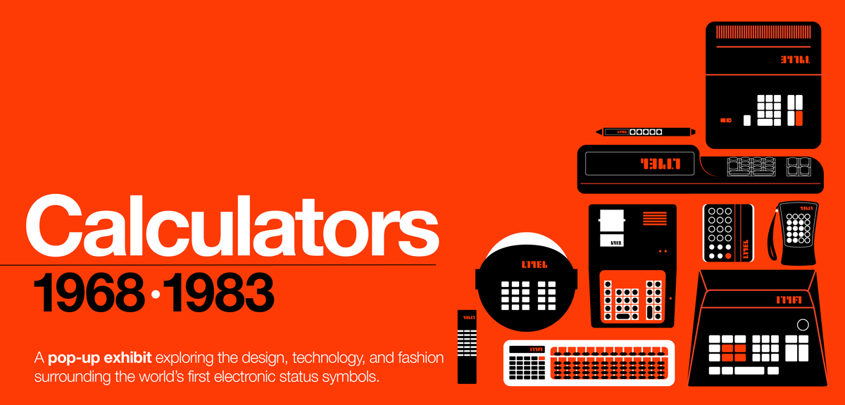The exhibit highlights more than 100 calculators, all beautiful examples of late 20th Century design.